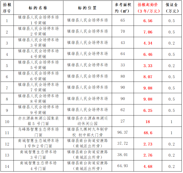 受相關(guān)產(chǎn)權(quán)人委托,公開拍租鎮(zhèn)雄縣國有資產(chǎn)使用權(quán)。拍租遵循公開、公平、公正、誠實信用、價高者得的原則?,F(xiàn)將有關(guān)事項公告如下: