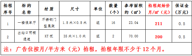 (四)拍租鎮(zhèn)雄縣開(kāi)元商業(yè)物業(yè)服務(wù)有限公司以勒高鐵站站前廣場(chǎng)各類(lèi)廣告位使用權(quán),詳見(jiàn)下表: